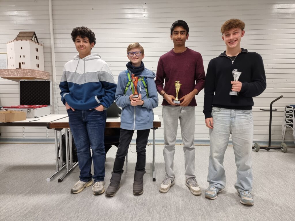 Die Gruppen D und E (Anfänger) spielten ihre Sieger in einem Schnellturnier aus, mit Rundensystem in jeder Gruppe, bei je fünf Teilnehmer:innen. Hier hatten wir auch die Jugendlichen entsprechender Spielstärke aus Stadtallendorf eingeladen und damit deren Einladung vom Sommer erwiedert. Zwei Jugendliche aus Stadtallendorf waren gekommen. Einer von ihnen, Tim Bulla, machte am meisten aus seiner Bedenkzeit und gewann die Gruppe D. Den zweiten Platz in dieser Gruppe belegte Jonas Uhde.
