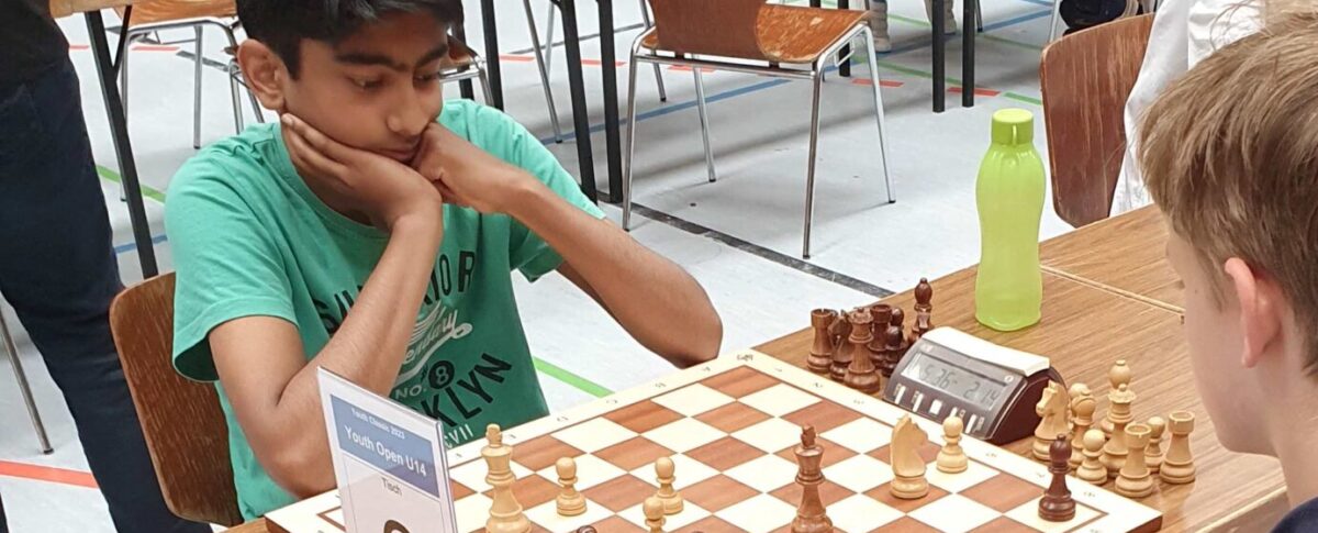 Schließlich Aarush, der sich in der U14 Großes vorgenommen hatte und außer einem Remis in der dritten Runde keine Punkte abgab – bis er in der vorletzten Runden vom späteren Turniersieger abgefangen wurde. Immerhin 5,5 Punkte und damit der 3. Platz, der mit einem aktuellen Chess Base Paket wertvoll und verdient belohnt wurde.
